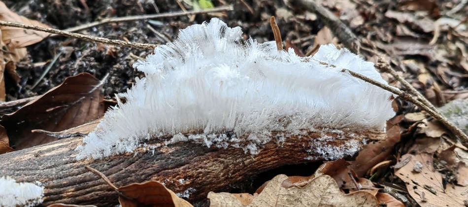 Leider spielt das Wetter noch nicht so recht mit: die tiefhängenden Wolken haben sich in den Winterwald verkrallt und geben keine Sicht frei. Für mich aber kein Verlust, denn diese spannende Stimmung hat auch etwas. So achtet man eher auf die naheliegenden Dinge am Wegrand. Zum Beispiel dieses zarte Gespinst aus Feenhaar, das aus manch abgestorbenen Ast am Waldboden wächst. An sich ist es ja gefrorenes Wasser, dass aus winzigen Löchern des Totholzes austritt. Grund dafür ist ein im Holz wohnender Pilz, der vermutlich als Frostschutz das Wasser nach außen verdrängt. Das Haareis ist eine der faszinierendsten Erscheinungen im Wald, wenn die Temperaturen gerade so um den Gefrierpunkt liegen.