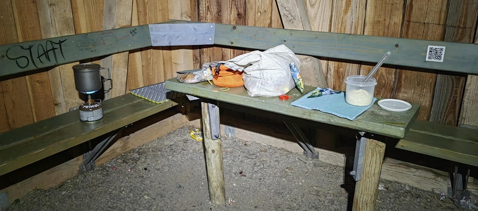 Als Übernachtungsorte habe ich mir einfache Schutzhütten am Wegesrand ausgesucht. Ich hoffe, dass in allen die Sitzbänke ausreichend breit sind, dass ich mich mit meinem Schlafsack drauflegen kann. Auf dem kalten Boden möchte ich trotz dicker Isoliermatte unter dem Schlafsack nicht liegen. Aus diesem Grund habe ich auch meinen Kocher dabei, Gaskartusche und Essen für mehrere Tage.