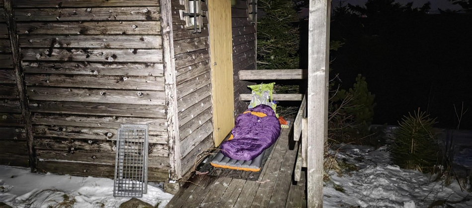 Obwohl ich natürlich wusste, dass die Nächte kalt werden, sind die ersten Nächte doch wirklich richtig frisch. Bei weniger als -10°C wird mir sogar in meinem Mountain Equipment Helium 600 Schlafsack an den Füßen kalt. Drei Hosen und die Füsse in den Armen meiner Überjacke helfen, dennoch halbwegs warm zu bleiben. Ein Schlafsack ohne dicke Kapuze wäre jetzt völlig ungeeignet – mehr als ein schmaler Sehschlitz lasse ich in der Nacht nicht offen. Doch so fühle ich mich im hellen Schein des Vollmondes in meinen Übernachtungshütten geborgen.