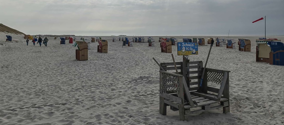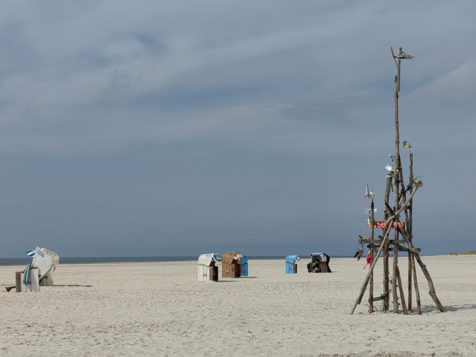 Um 10 Uhr mogelten sich Petra und ich auf die Fähre von Hörnum nach Wittdün. Mogelten, weil am Vortag hatte man uns noch recht schroff gesagt, es sei keine Kapazität mehr frei für die Überfahrt. Doch mit etwas Glück und einem freundlichen Lächeln sind wir dann doch auf die noch flachere Insel Amrum gekommen. Am Kniepsand haben wir „Mittagspause“ gemacht. Diese große Sandfläche vor der eigentlichen Insel ist der Schutz Amrums vor den Winterstürmen, die von anderen Inseln schon große Teile abgetragen haben. Hier gibt es „geduldete“ Standhütten – so lange sie ausschließlich aus Dingen zusammengezimmert sind, die Am Strand angeschwemmt wurden – vielleicht die Gelegenheit, dort die kommende Nacht zu verbringen. Denn die Jugendherberge ist – es sind Osterferien – komplett ausgebucht.