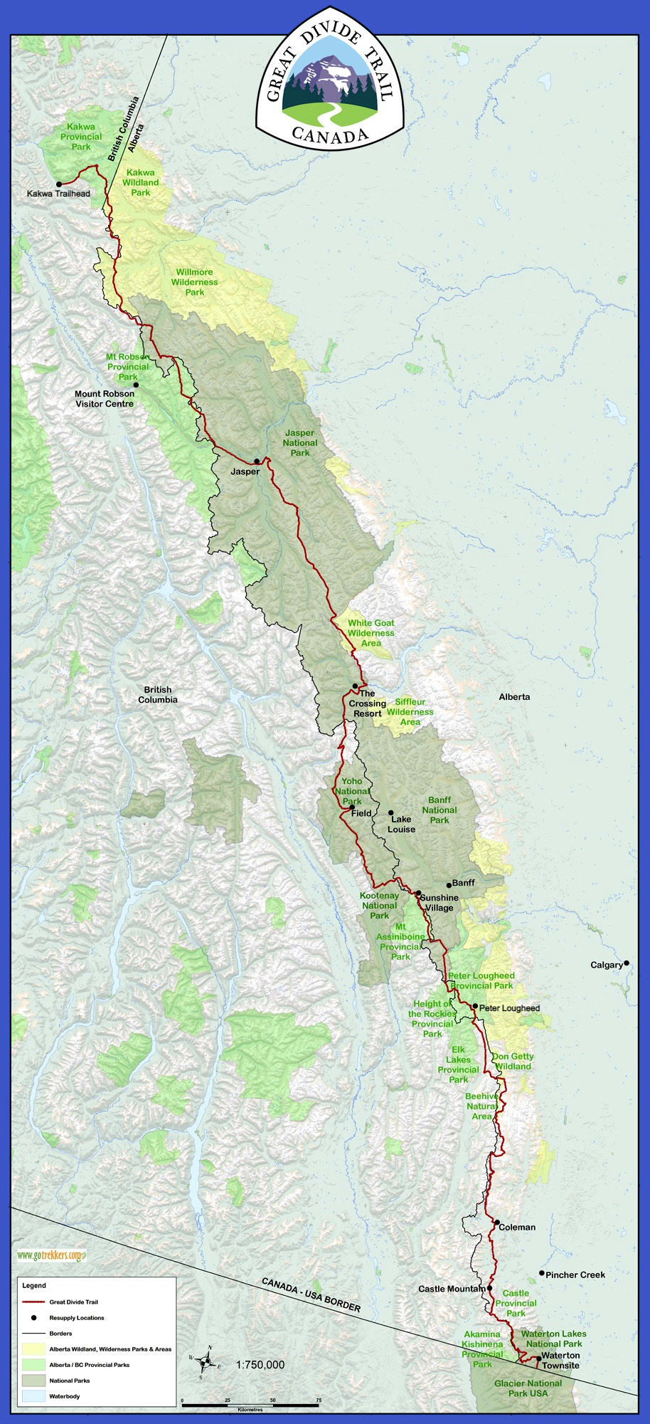 Der Great Divide Trail beginnt, wo der Central Divide Trail in den USA endet (am Waterton Lakes National Park). Genauso wie das Pendant in den USA begleitet der Wildniswanderweg die Wasserscheide zwischen der Westküste Canadas und der Prärie im Osten der Rocky Mountains.